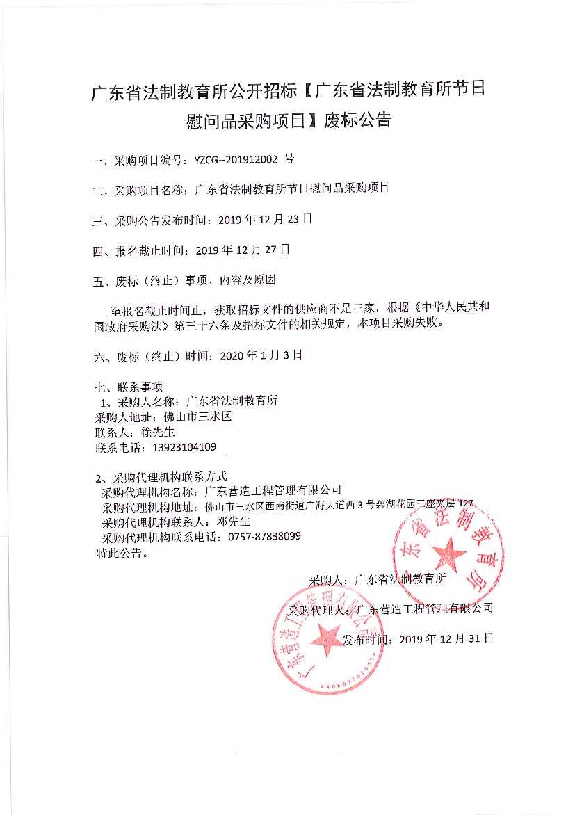 广东省法制教育所节日慰问品采购项目废标公告