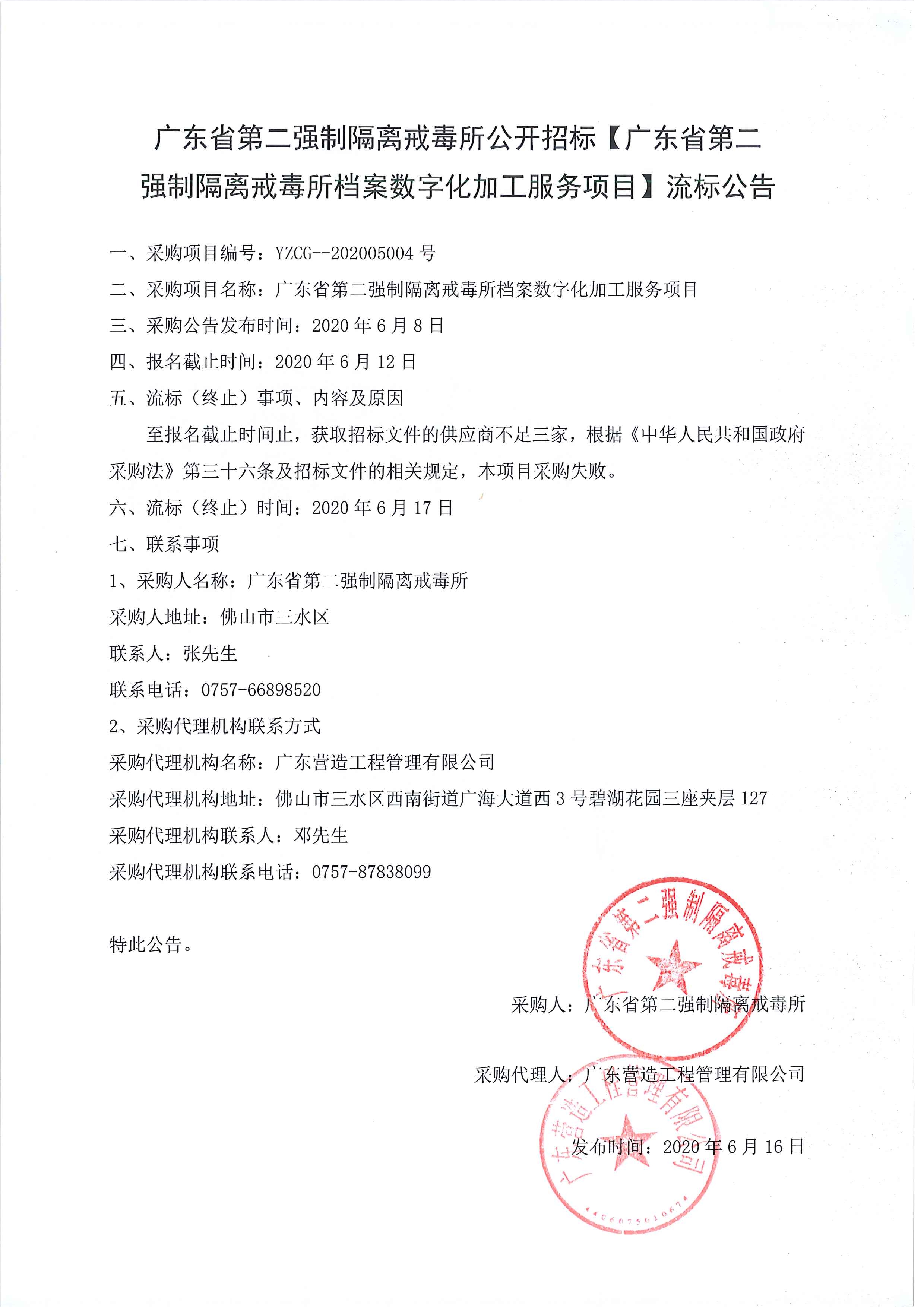省二戒所档案数字化加工服务项目流标公告
